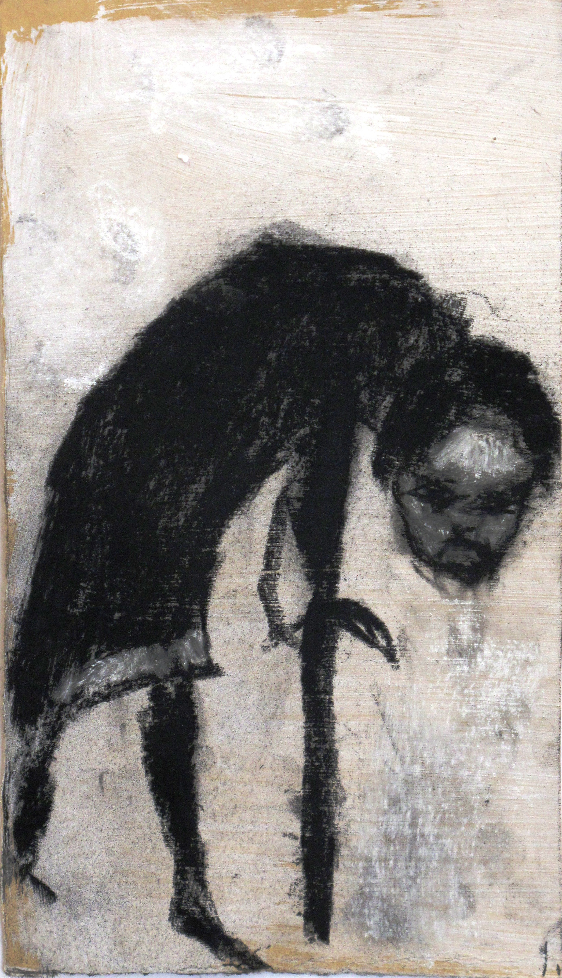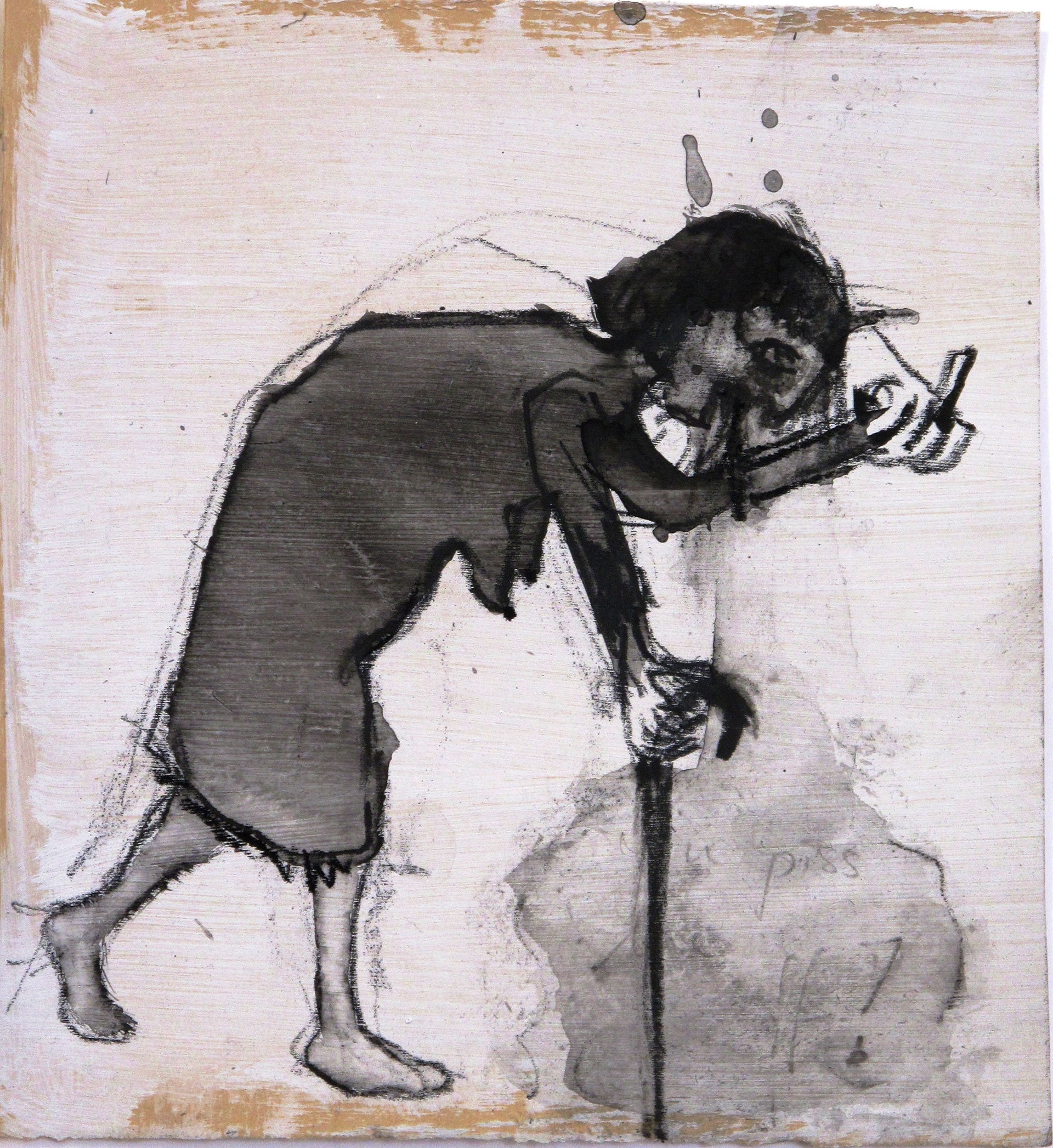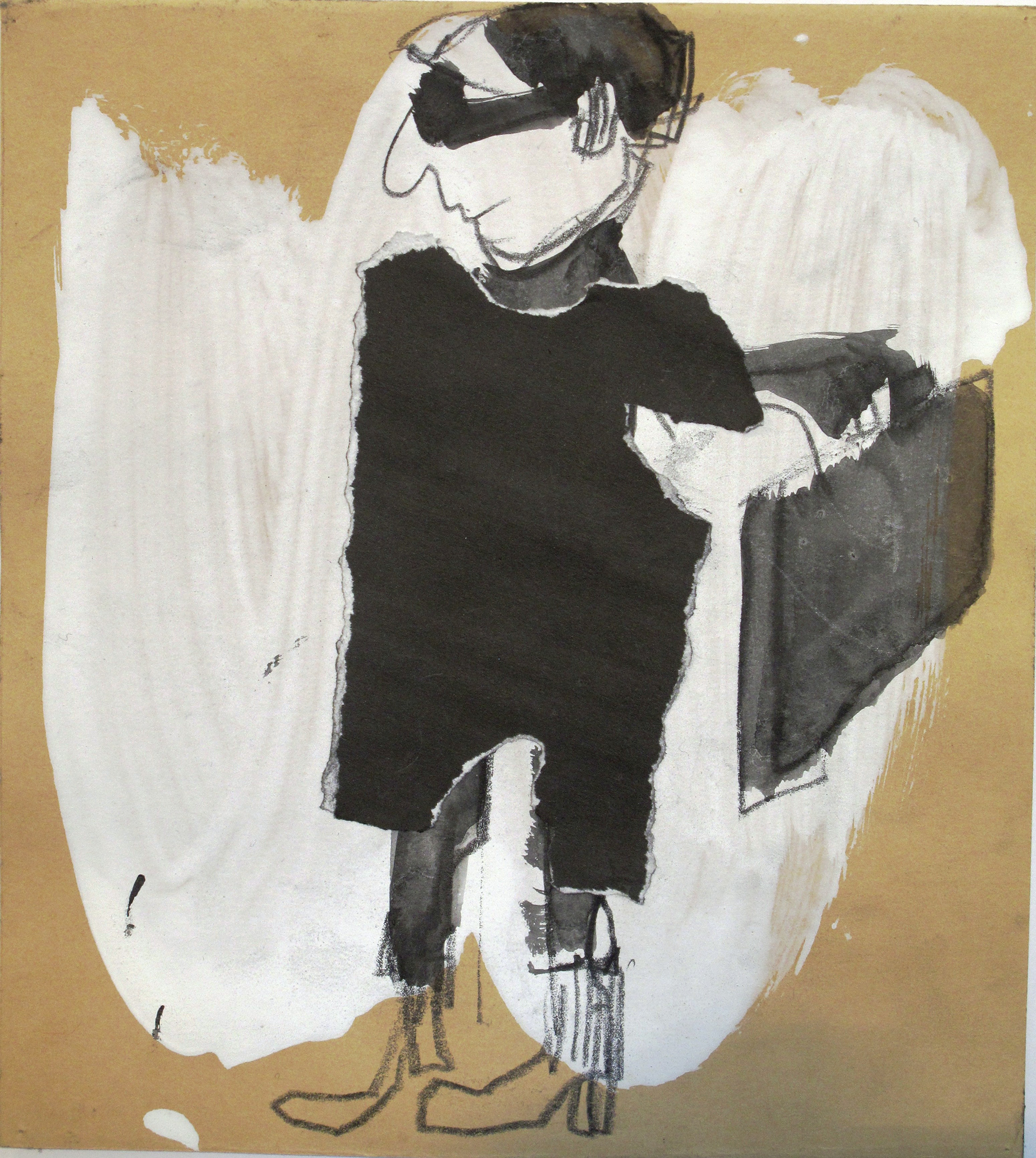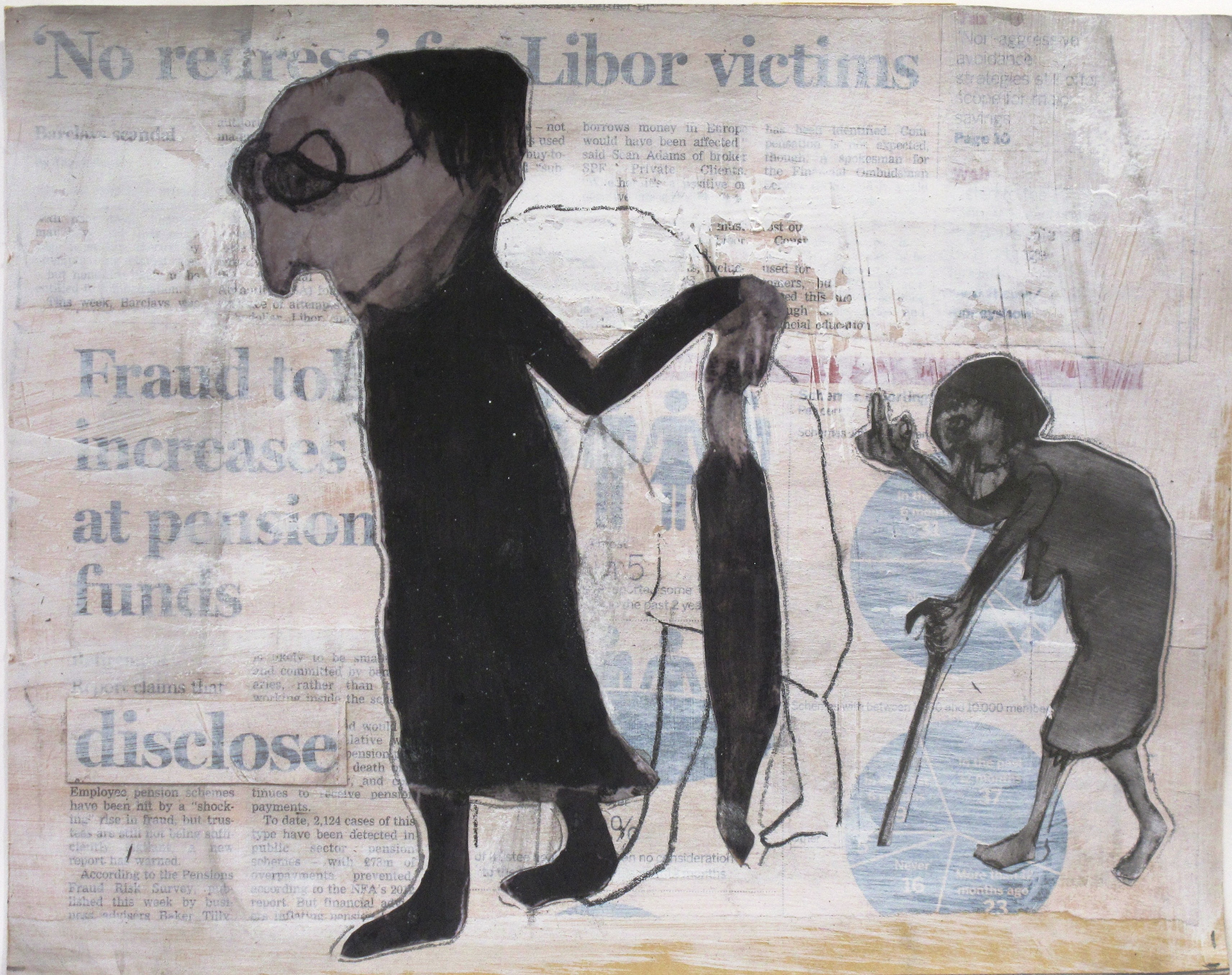 In this body of work, I used still life as an entry point. Gradually elements of the original still life transformed themselves… pomegrenates turned into ‘pomegrenades’ or Molotov cocktails, bottles turned into iconic buildings of the City of London(Gherkin, Stock Exchange, Citi Bank…) My studio shelf turned into London Bridge… London Bridge became a stage… upon this stage a kind of ‘Newspaper Theatre’ played out which comments on, interrupts and reshapes fragments of collaged newspaper narrative.